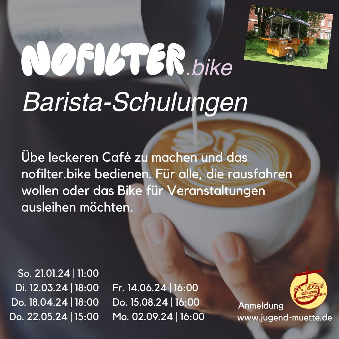 In der Barista Schulung lernst du leckeren Cappuccino, Latte und Espresso mit der Cafémaschine auf dem nofilter.bike zu machen. Außerdem erhältst du eine Einweisung in die Funktionsweise und die Idee des nofilter.bike. So wirst du fit, dich auf den Weg zu machen neue Erfahrungen zu sammeln und Kirche zu den Menschen zu bringen. Für Kirchengemeinde und Einrichtungen, die das nofilter.bike für Feste und Veranstaltungen ausleihen möchten ist die Schulung eine Voraussetzung.